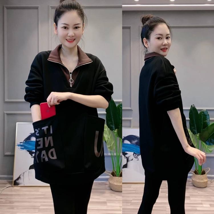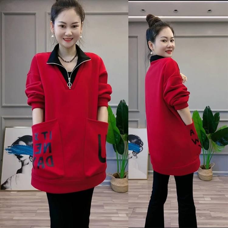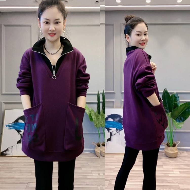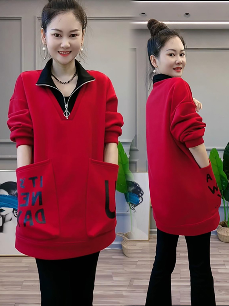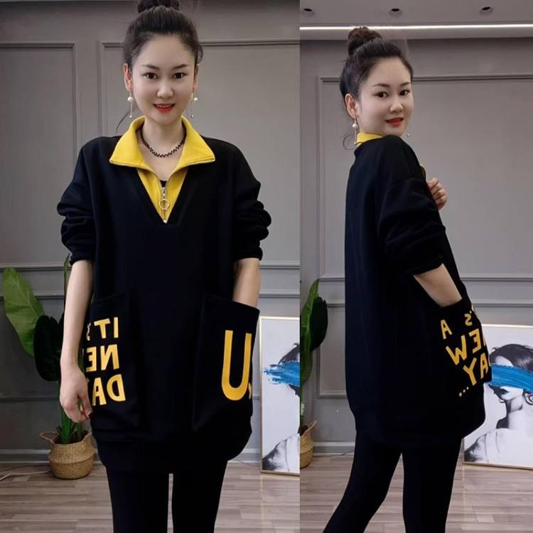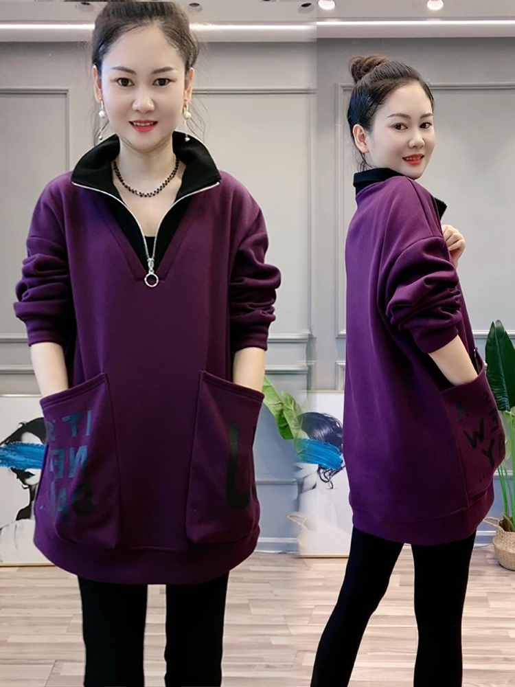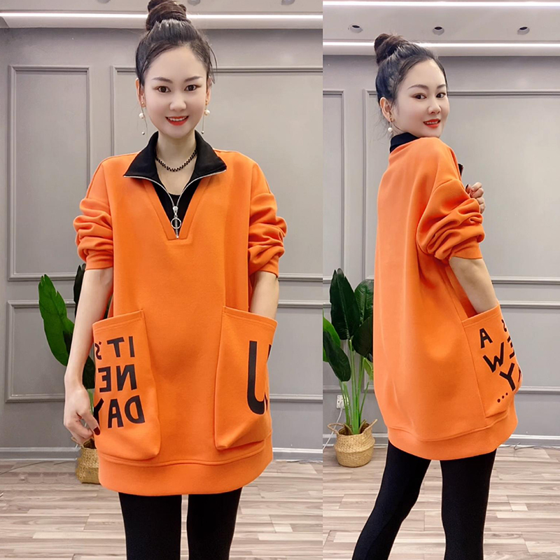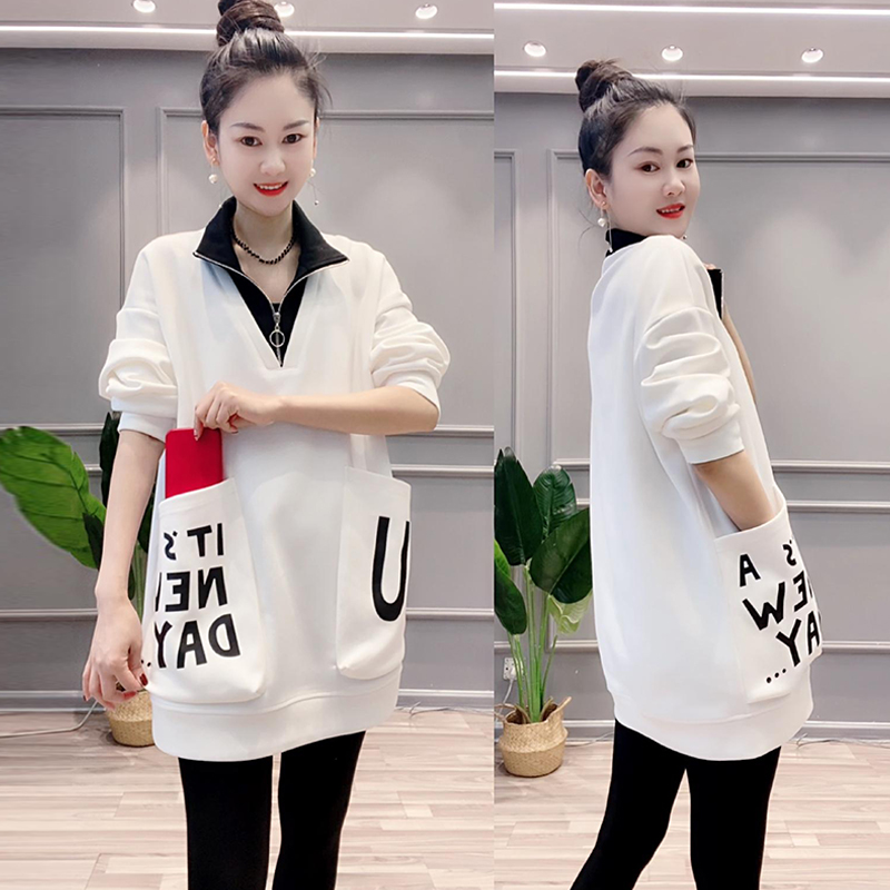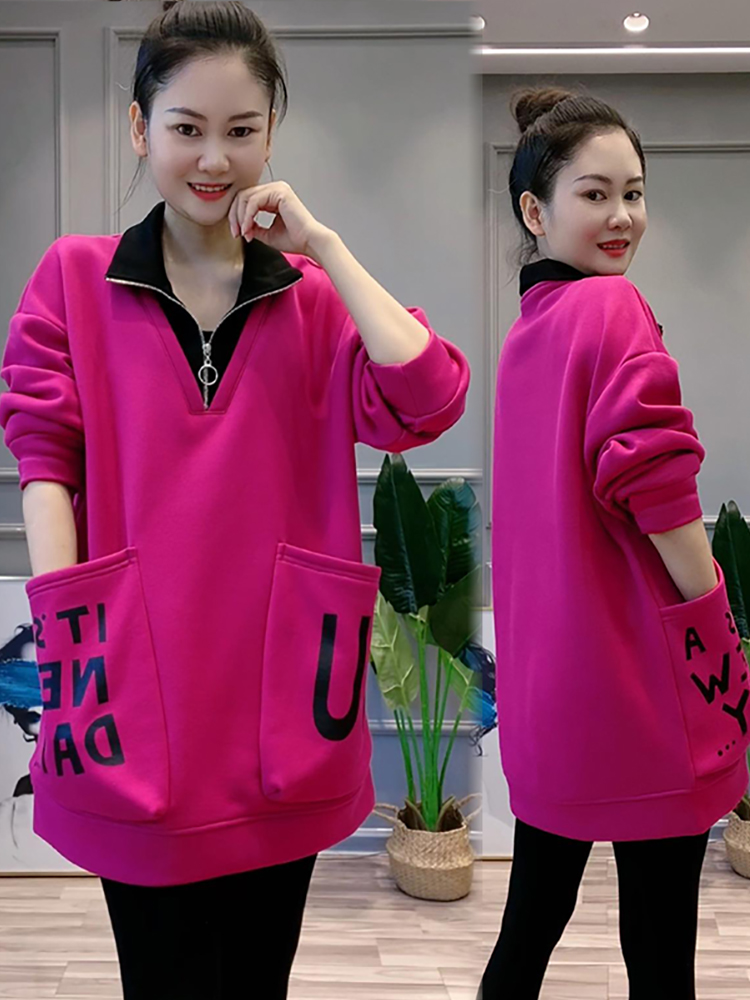 時尚長袖衛衣女大尺碼寬鬆中長立領口袋印花休閒